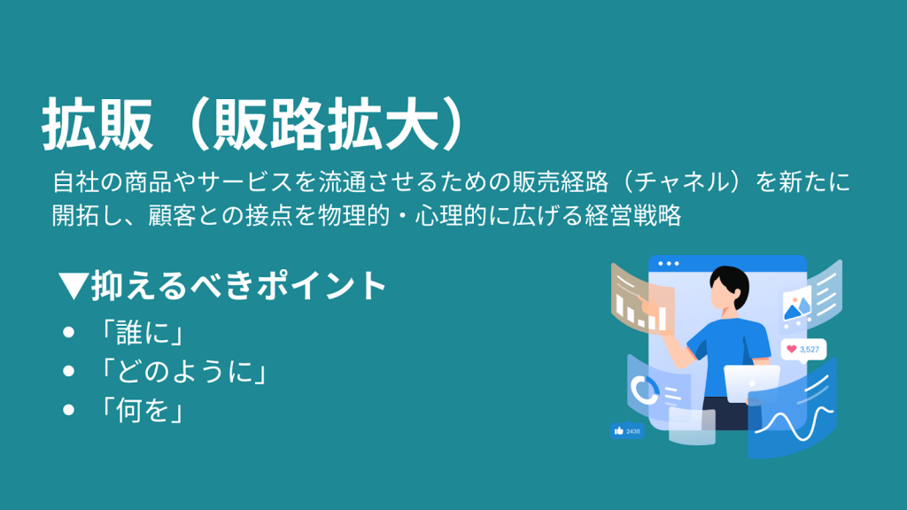 拡販(販路拡大)とは、自社の商品やサービスを流通させるための販売経路(チャネル)を新たに開拓し、顧客との接点を物理的・心理的に広げる経営戦略のことです。