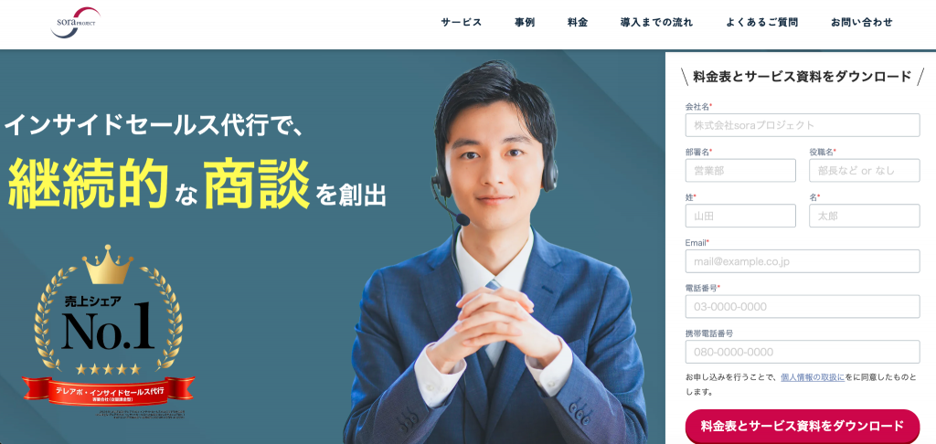 soraプロジェクトは、法人向け営業代行で16年以上の実績を持つ会社です。130万コール以上の実績をもとに構築された法人データベース(約800万社)を活用し、商材に合わせたターゲットリストの設計から支援できます。