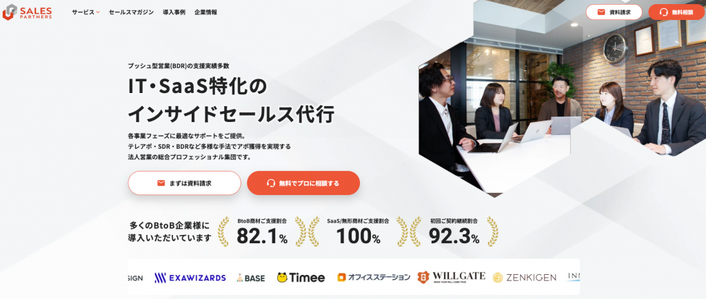 スタジアムは、IT・SaaSに特化したインサイドセールス代行「セールスパートナーズ」を提供しています。SaaS・無形商材の支援割合が100%で、BtoB商材の支援割合も82.1%と高く、ITリテラシーが高いメンバーが揃っている点が特徴です。