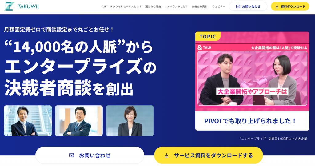 大手企業への新規開拓にお悩みなら、決裁者との商談獲得に特化した「タクウィルセールス」がおすすめです。
