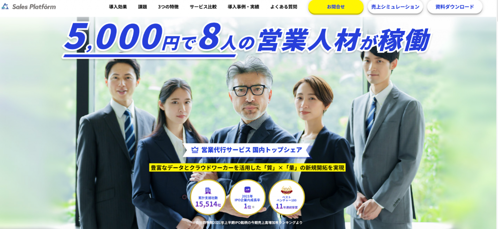 特にインサイドセールスの代行に強みをもっています。アポイントの獲得からウェブ商談、非対面でのクロージングまでをワンストップで任せられる点が特徴です。