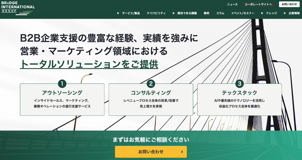 | ブリッジインターナショナル株式会社 | ・対話重視のインサイドセールスで関係構築 ・営業プロセスの分業設計で組織全体の効率を最適化 ・教育済み固定メンバー+KPI管理で成果を最大化 |