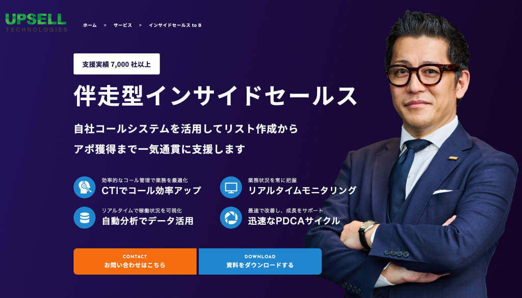 アップセルテクノロジィーズ株式会社は、7,000社以上の支援実績を誇るインサイドセールス代行サービスです。