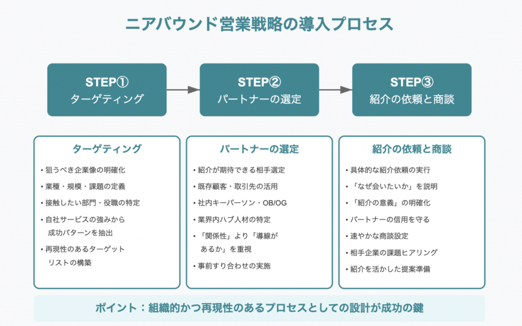 ニアバウンド営業を戦略的に機能させるには、偶発的な紹介に頼るのではなく、組織的かつ再現性のあるプロセスとして設計する必要があります。