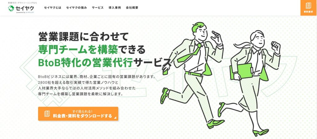 | 株式会社ウィルオブ・ワーク | 成果報酬で対応可能 | 『セイヤク』は、 企業の営業課題を成果に直結する形で解決する営業代行サービスです。 | https://lp.seiyaku-sales.jp/general/index.html |