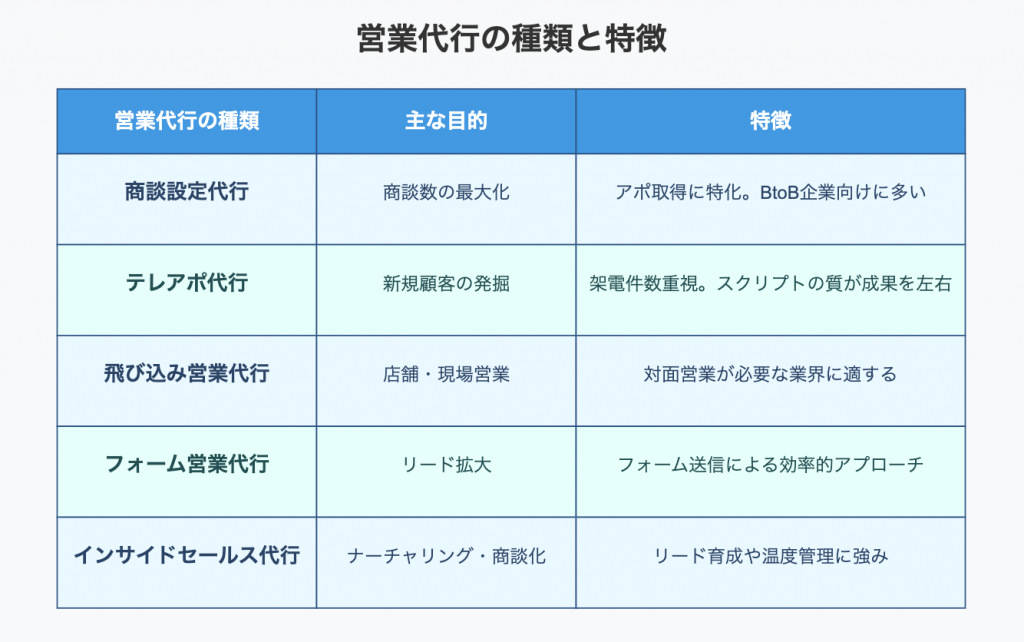 営業代行と一口に言っても、業務内容や支援スタイルには大きな違いがあります。目的や営業フェーズに応じて最適な代行タイプを選定することが、成果最大化の鍵です。