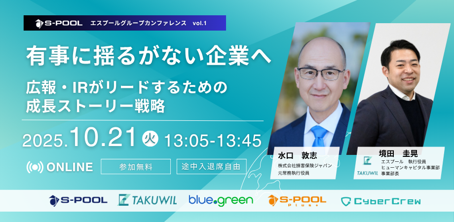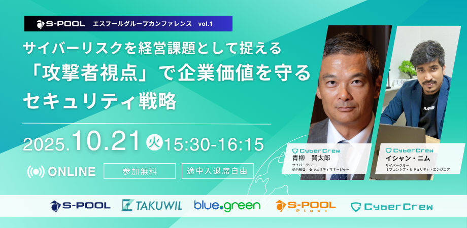 | 登壇者 | ・有事に揺るがない企業へ 広報IRがリードするための成長ストーリー戦略 株式会社エスプール 執行役員 境田 圭晃 株式会社損害保険ジャパン 元常務執行役員 水口 敦志 ・事例から読み解く、企業価値向上を実現するサステナビリティ経営 株式会社エスプールブルードットグリーン 執行役員 榎本 貴仁 ・障がい者雇用を「義務」から「人的資本投資」へ 法律と市場変化から考える意義とは 株式会社エスプールプラス 経営企画室 室長 岡本 暁 ・サイバーリスクを経営課題として捉える 「攻撃者視点」で企業価値を守るセキュリティ戦略 株式会社CyberCrew 執行役員 青柳 賢太朗 株式会社CyberCrew オフェンシブ・セキュリティ・エンジニア イシャン・二ム |